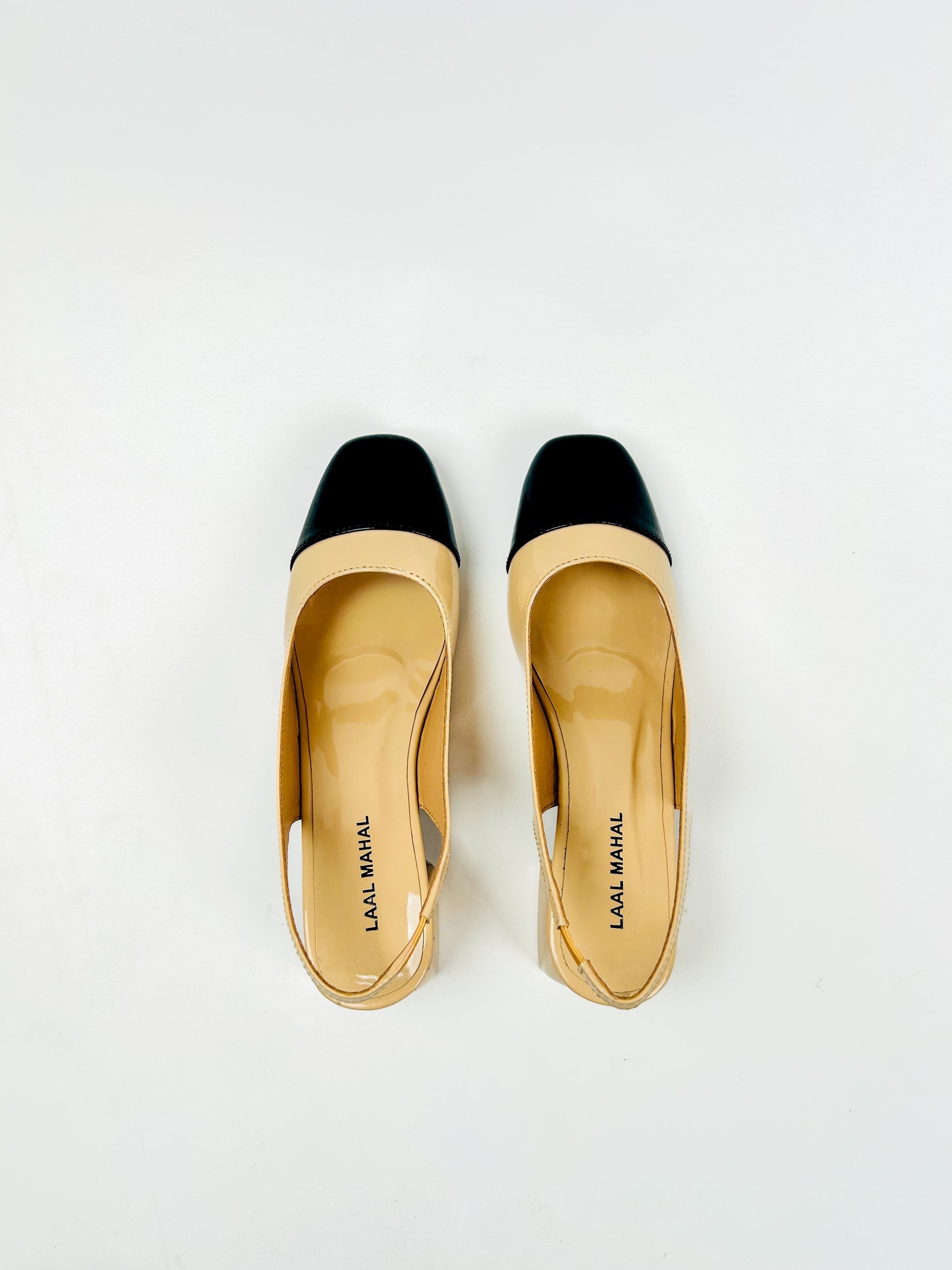 Beige & Black Slingback Heels! Chic square toe, glossy patent contrast, and a stable block heel. Your new go-to for instant polish.